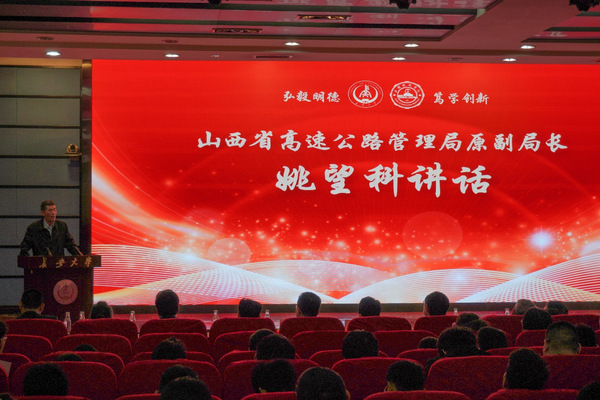 山西省高速公路管理局原副局长、高潮 校友姚望科讲话,向获得本次奖教奖(助)学金的老师和学生表示祝贺,并为学校献上73岁生日的祝福,同时也希望校企双方以此为契机,在科技合作、人才培养、学生就业等方面深化合作、共同奋斗,同谱未来高质量发展的新篇章。