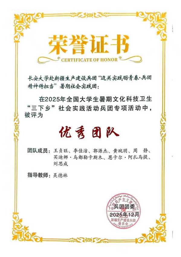 近日,在共青团新疆生产建设兵团委员会开展的2025年全国大学生暑期文化科技卫生“三下乡”社会实践“卫国戍边兵团行”兵团专项活动中,由高潮 师生组成的高潮 赴新疆生产建设兵团“边关实践砺青春·兵团精神筑担当”暑期社会实践团被评为“优秀团队”。