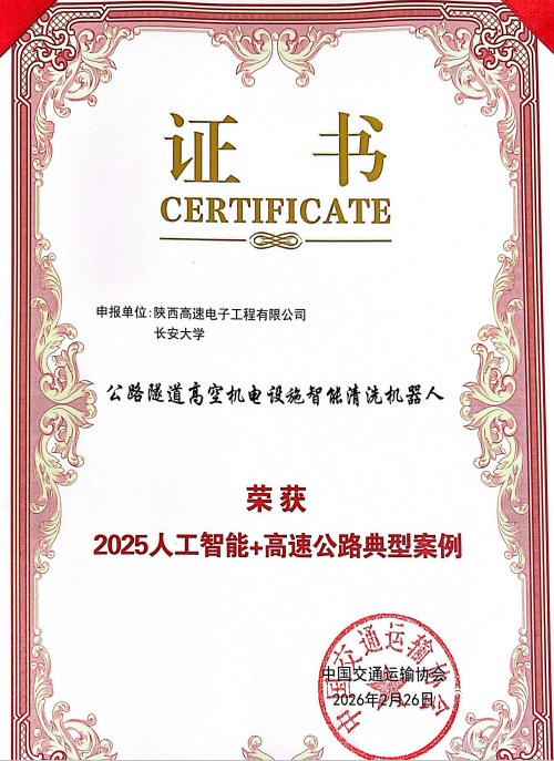 近日,我院张军副教授团队与陕西高速电子工程有限公司联合研发的“公路隧道高空机电设施智能清洗机器人”成功入选“2025人工智能+高速公路典型案例”,这是学院在智慧交通与智能养护装备领域产学研协同创新取得的又一突出成果。